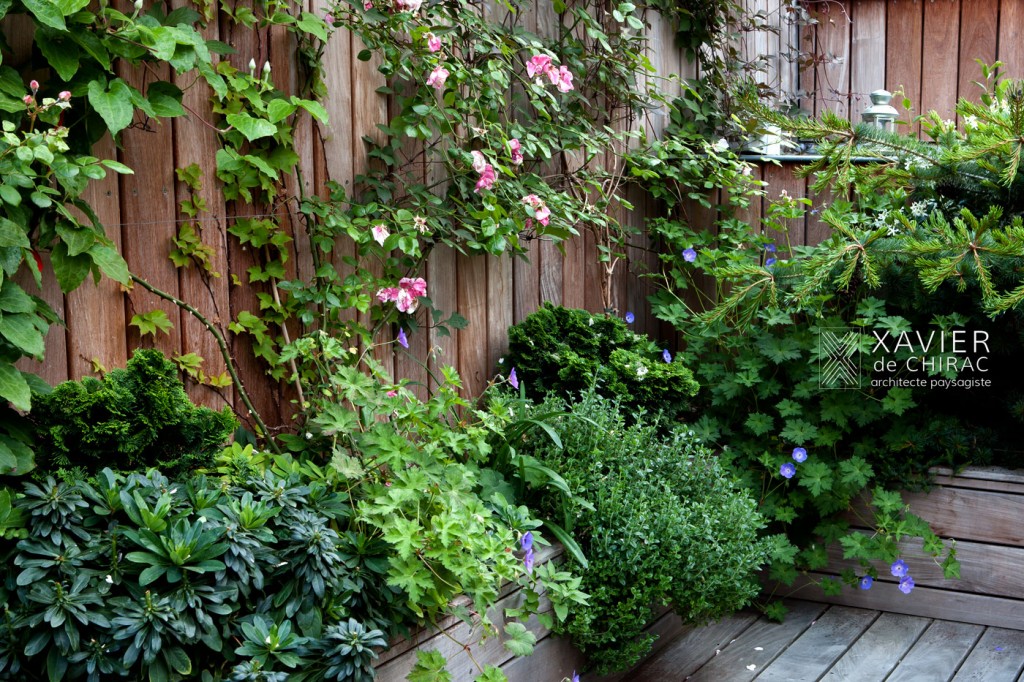 Plantes, Acer aconitifolium, Pinus, rosiers grimpants, vivaces. Habillage en bois des murs, cuisine d’extérieure.