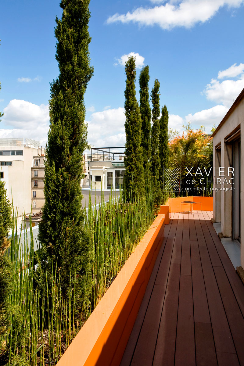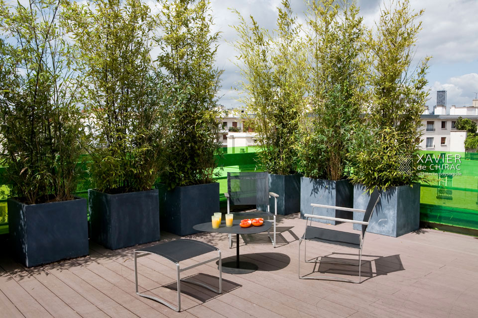 What is the best feature of an urban terrace? It offers an added living space where you can enjoy nature. Its rigorous conception leaves nothing to chance.The harmony in proportions, the rhythm created by the placements of pots, flower beds, the dynamic colours and the graphic style of the plants